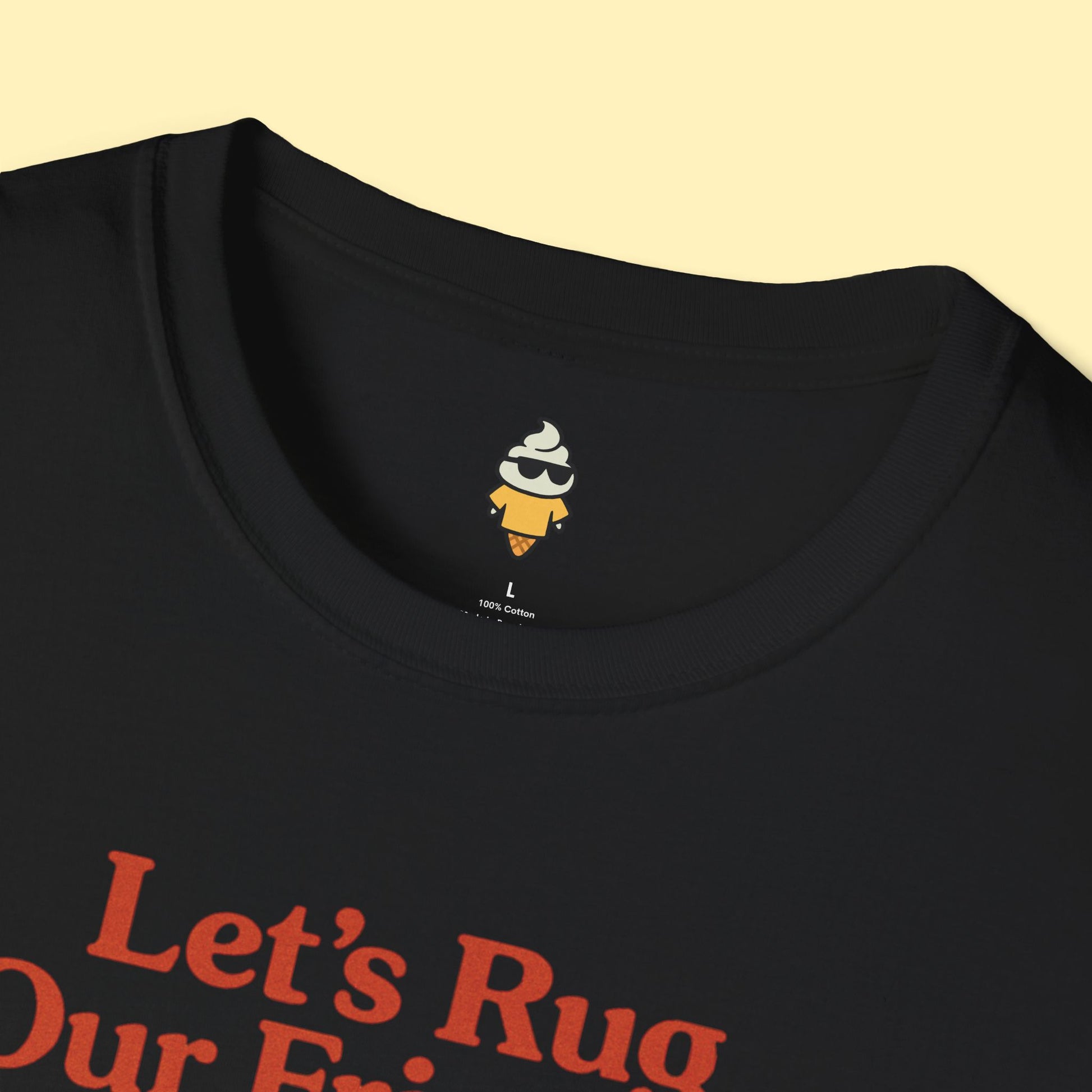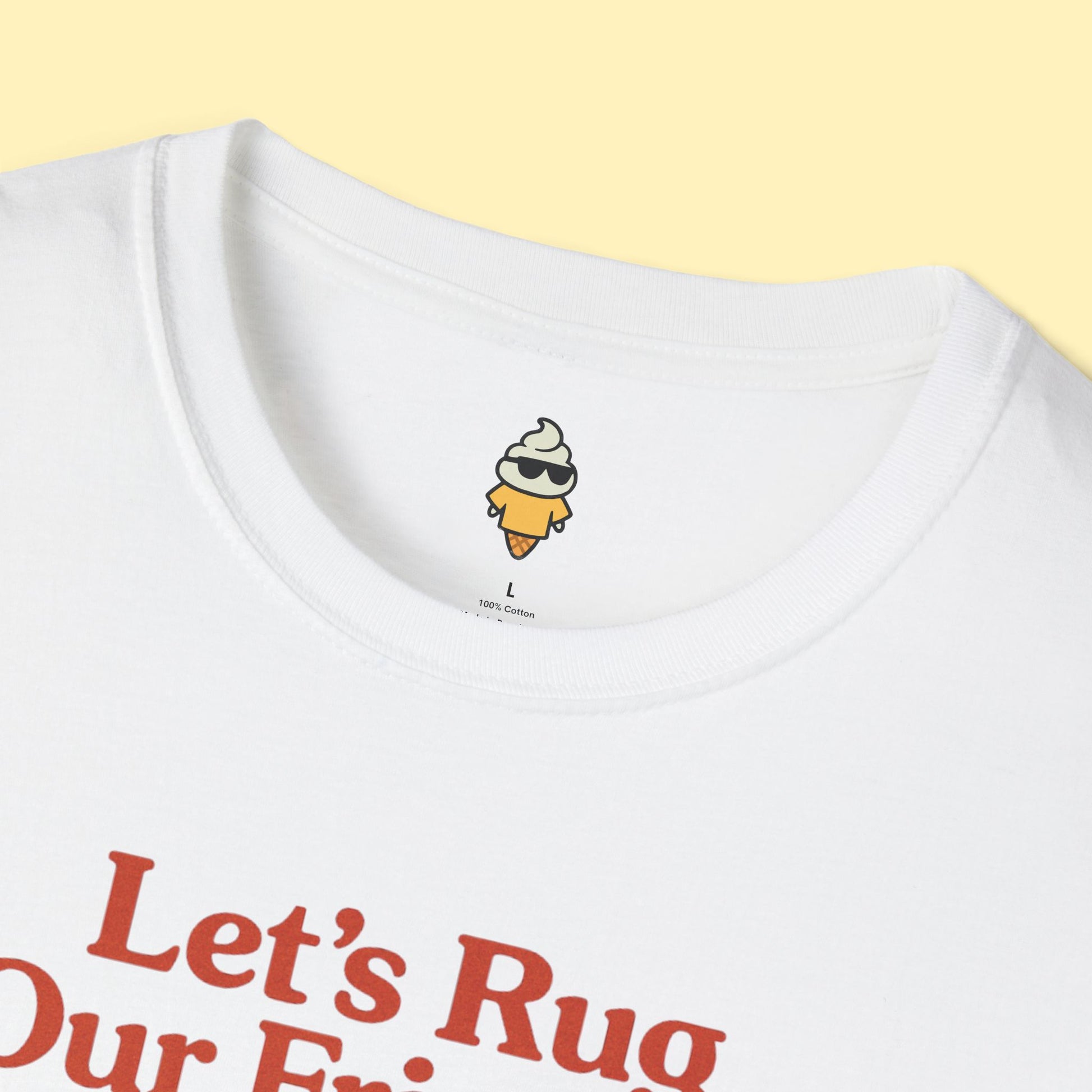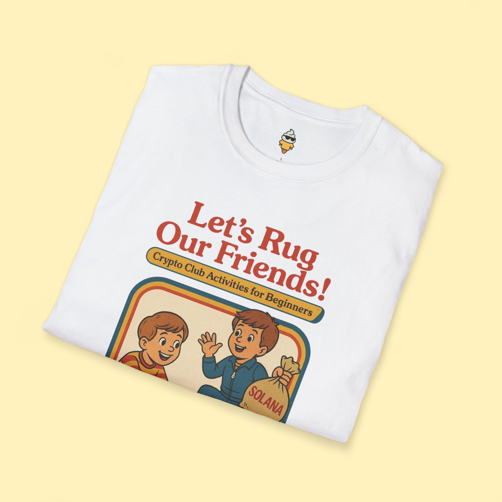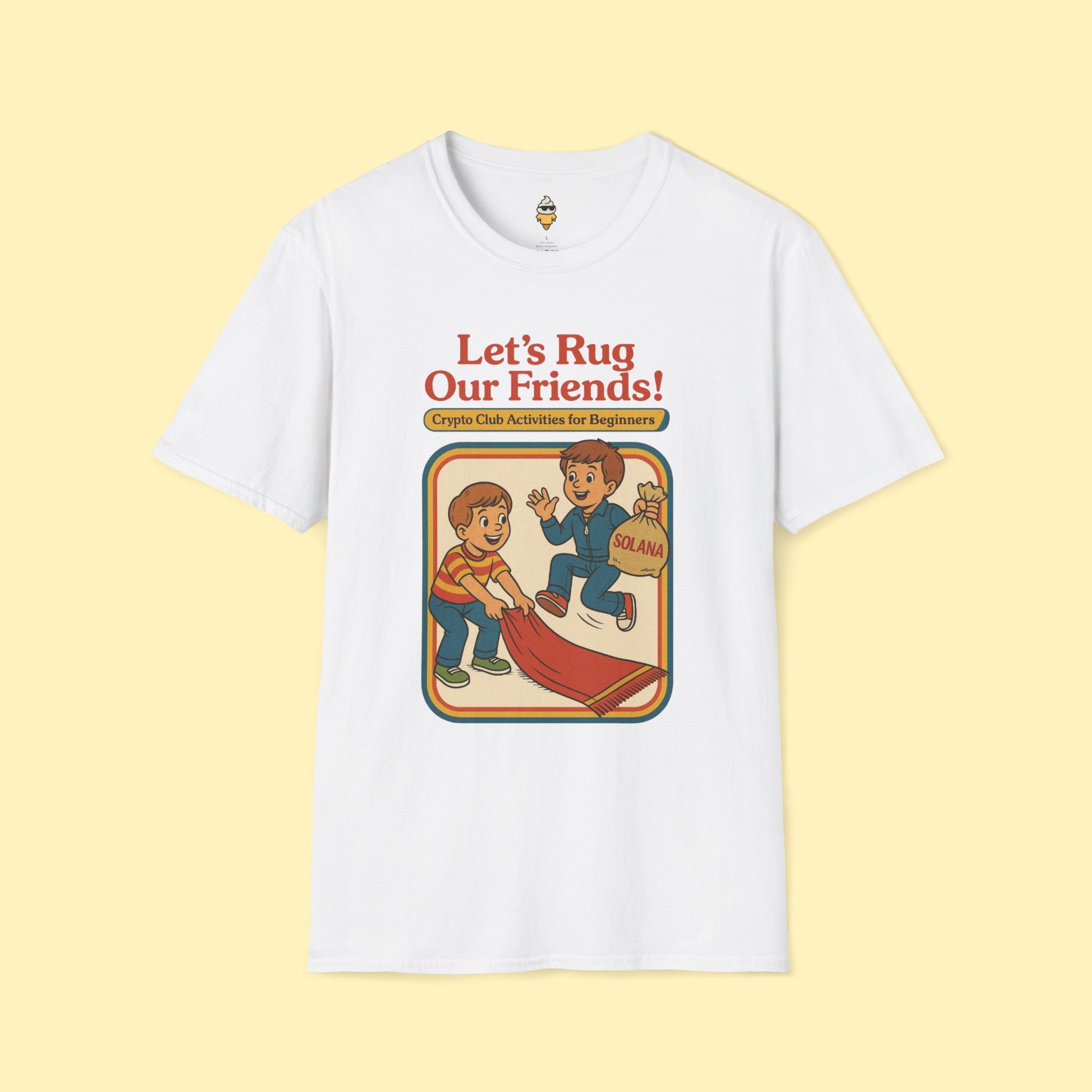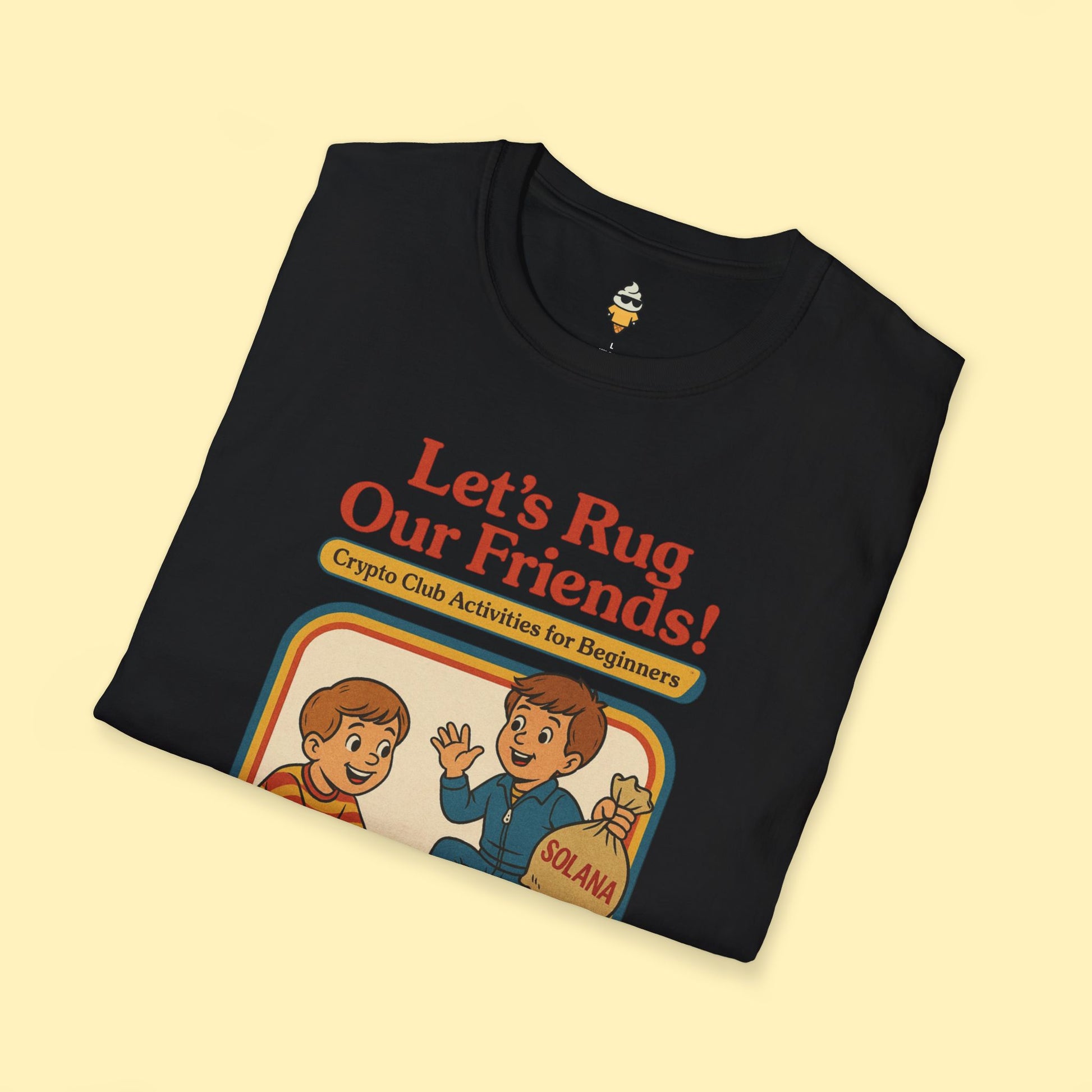 Step right up, junior scammers — it’s rugpull 101! This vintage-style “Let’s Rug Our Friends” tee perfectly captures the wholesome chaos of crypto culture. Featuring two cheerful kids reenacting every Web3 investor’s worst nightmare — one holding a Solana money bag, the other yanking the rug — this design is a hilarious nod to the golden age of decentralized betrayal.