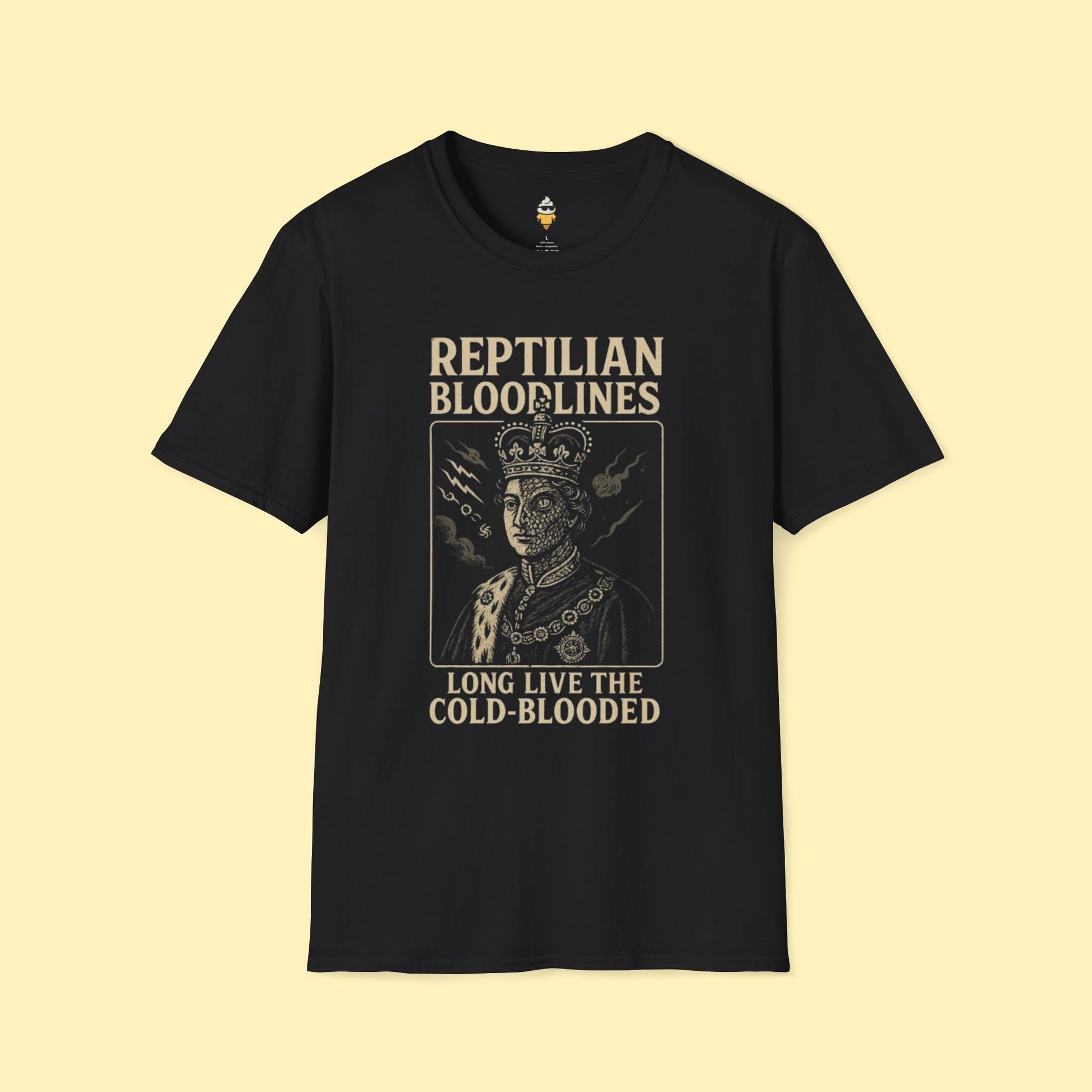Dive into the ultimate conspiracy with this edgy, tongue-in-cheek tee that asks the big questions about royal lineage. Featuring a regal figure with reptilian scales peeking through a classic monarch’s portrait, lightning bolts and storm clouds swirl ominously in the background — all rendered in a striking, vintage-inspired graphic.
