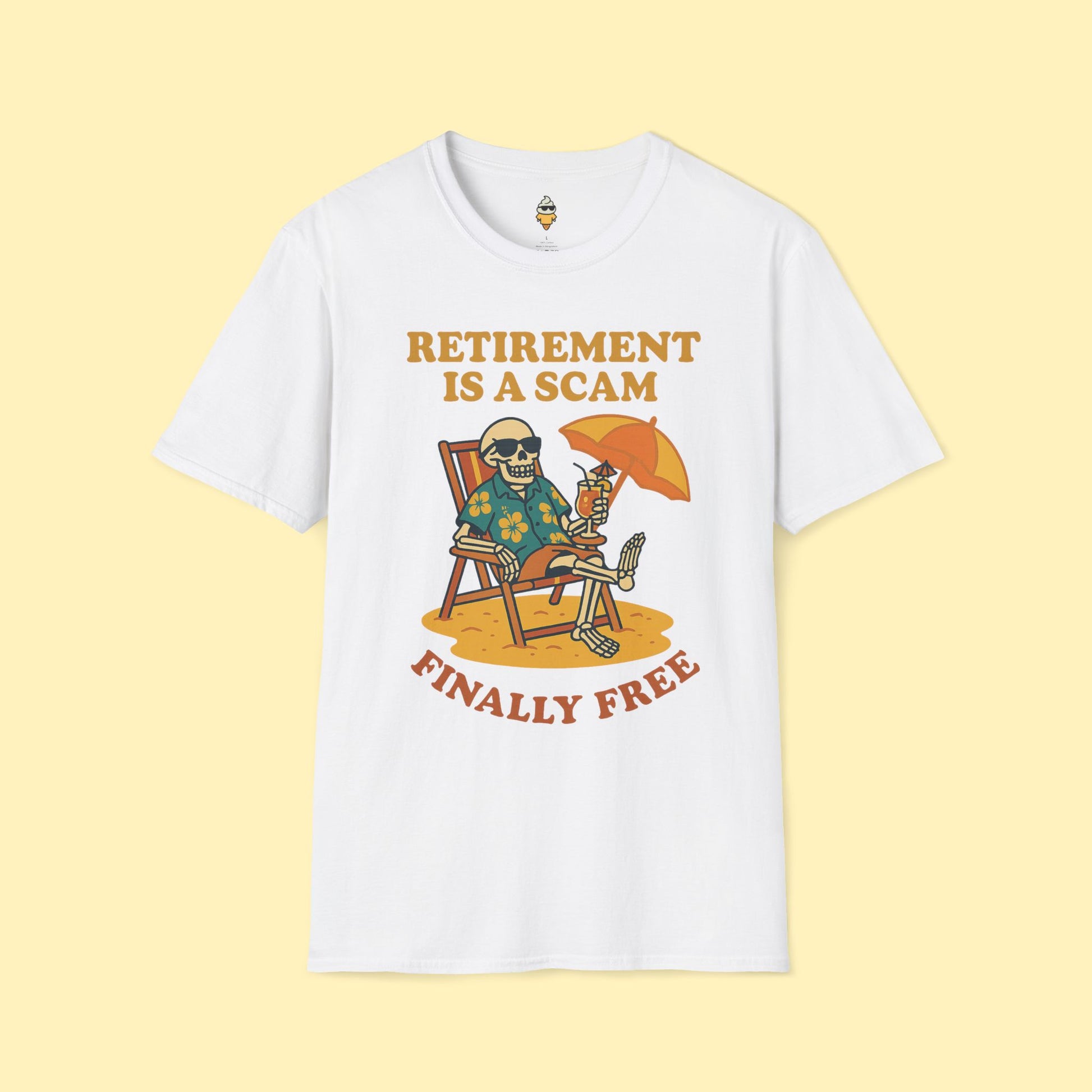Retirement Is a Scam Skeleton T-Shirt – Funny Dark Humor Beach Tee, Finally Free Shirt, Satirical Gift for Boomers or Burnouts