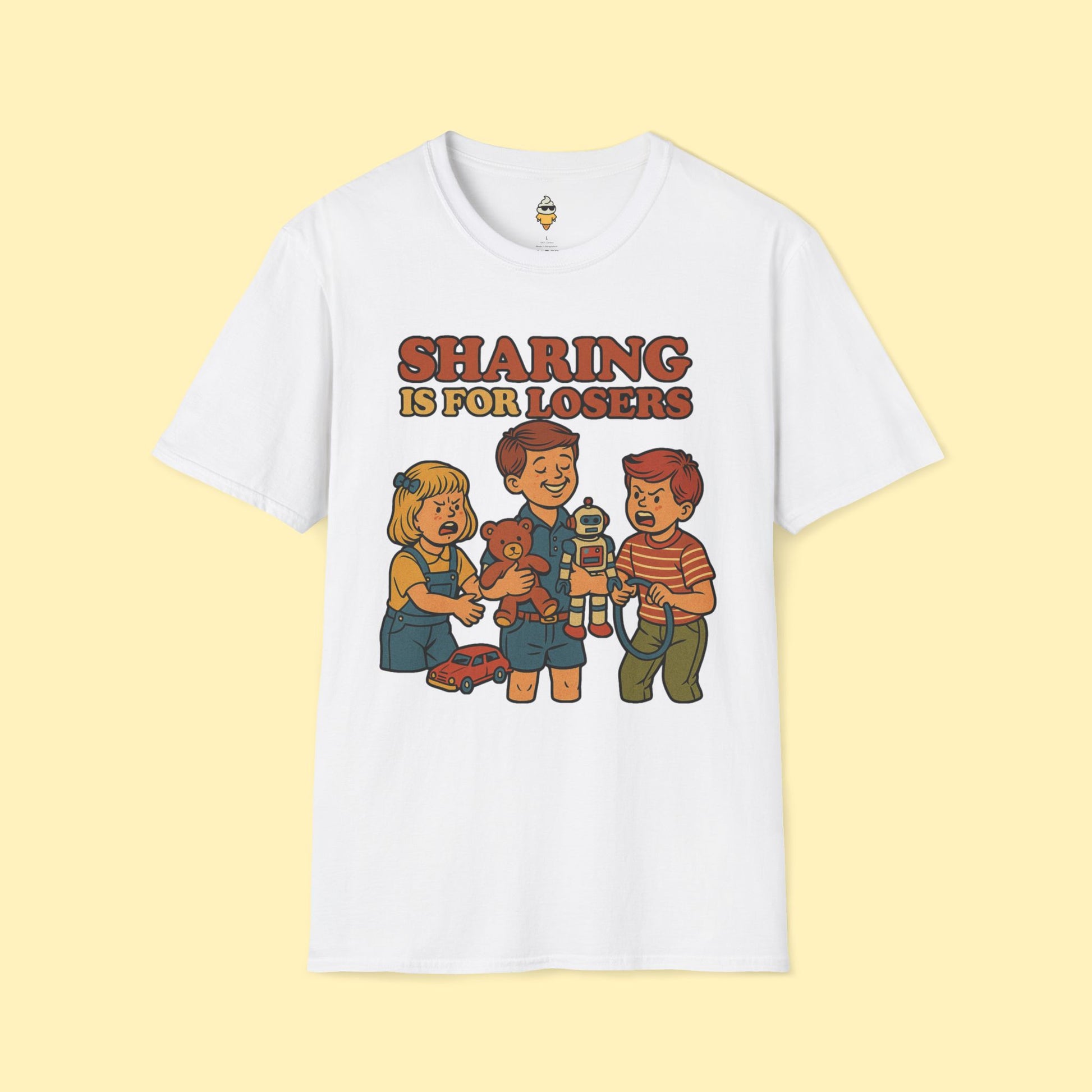 Remember those “sharing is caring” lessons from childhood? Yeah, forget those. This sarcastic retro-style t-shirt flips playground values on their head with a bold design that reads “Sharing is for Losers.” Featuring a smug kid hoarding toys while two others look shocked, this tee is perfect for rebels, introverts, and anyone who doesn’t play nice.