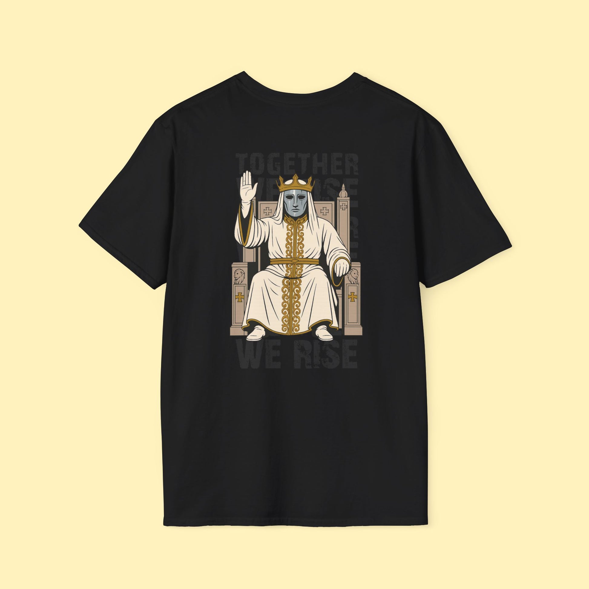 Stand tall in unity with this bold “Together We Rise” graphic tee, featuring a powerful medieval king seated on a throne, robed in white and gold with a silver mask and crown. The detailed artwork symbolizes strength, leadership, and solidarity, making it a striking piece for anyone who loves historic, gothic, or medieval-inspired fashion.